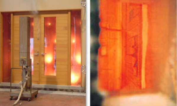 木製ドアの熱の伝わりにくさは、アルミの約1500倍を誇り、ドアの片面が燃えても、反対面をさわることができるほどです。また、アルミ製のドアに比べて、熱による変形も抑えられます。